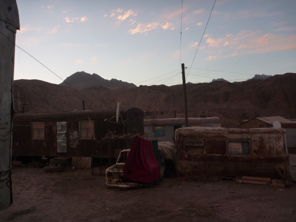 der grenzuebertritt hierher war wieder mal spektakulaer. wir haben inzwischen die vermutung, dass es eine internationale konvention gibt, nach der grenzen mindestens doppelt so schaebig sein muessen wie der rest des landes, keine ahnung warum. die kirgisische seite also: hunderte von lastwagen, vor allem die schweren, uebergrossen, leeren chinesischen auf dem heimweg, neue waren fuer zentralasien holen, ineinandergeschachtelt, warten seit vier tagen darauf, dass die chinesische grenze wieder aufgeht, an feiertagen und wochenenden bleibt der schlagbaum unten. am rande dieser karavane das grenzdorf: ein sammelsurium rostiger bauwaegen, liegengebliebener lkw-anhaenger, ausgemuserter zerbeulter container, blech- und holzhuetten, fahrzeugruinen, der boden bedeckt mit scherben, knochen (zu wenig hunde, um die alle zu vertilgen), oellachen, unrat. mehrere hundert menschen warten hier oft tagelang, aber es gibt kein oeffentlches klo. kein fliessendes wasser im ganzen dorf. wir werden mit unseren leeren flaschen vage richtung fluss geschickt, bekommen dann doch was aus verschiedenen kanistern zusammengeschnorrt. zwielichtige kleine kaschemmen, in denen es vor allem schaschlik mit viel wodka gibt. eine sehr eigentuemliche und anregende atmosphahae, vor allem nach unserer bergeseinsamkeit. quentin tarantino waere hier gluecklich: from dusk till dawn...