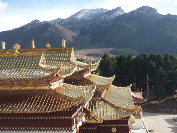 nach einer weiteren fahrt durchs traumhafte grasland kommen wir nach langmusi. ein kleines dorf, im wesentlichen eine strasse, aber wie ueblich die doppelte flaeche neubau drumherum. und wieder ein riesiges kloster. fuer unseren geschmack furchtbar viel zu protzig, alle daecher der mindestens zehn riesigen hallen und tempel sind mit neuem goldblech verkleidet, uns traenen die augen vom geblinke.