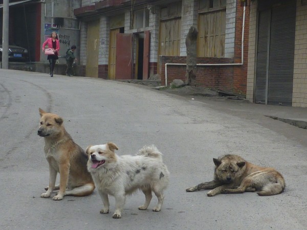 schaebig - und unfassbar dicht besiedelt! es gibt nie einen blick in irgendeine richtung ohne haeuser. es sind immer und ueberall menschen. die ersten hundertzehn kilometer nach chengdu gabs noch nicht mal eine einzige bauluecke, hundertzehn kilometer bebauung am stueck!!! die punkte auf unserer landkarte, die wir als doerfer erwartet hatten, sind immer gleich grosse staedte. kilometerweit. die haeuserfronten bestehen immer aus rolltoren, egal, ob laeden, restaurants, teehaeuser, werkstaetten oder wohnungen. das ganze leben spielt sich in diesen nach vorne offenen raeumen ab, also quasi auf der strasse. oft ist irgendwo noch eine gemauerte kochstelle, steht ein sofa oder ein paar stuehle, manchmal ein elektrischer heizstrahler unter dem tisch. zig laedchen reihen sich aneiander, die alle im wesentlichen zigaretten, kekse, alkohol und ein bisschen haushaltswaren anbieten. mini restaurants reihen sich aneinander, mit kleinen tischchen und kinderstuehlen- oder hockern, weil der platz zu eng ist fuer grosse tische und stuehle. die "teehaeuser" sind eigentlich immer "spielsalons", manchmal haben wir den eindruck, dass das halbe dorf, jung und alt, maenner wie frauen, in den teestuben sitzt und karten spielt, egal zu welcher tageszeit. und wer kein geld hat, steht drumrum und schaut zu...
